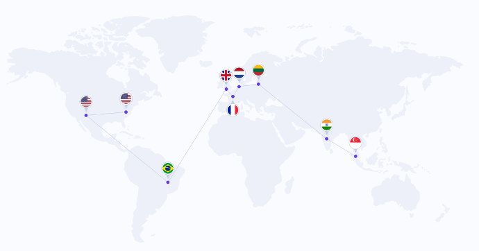 We offer server locations in: USA, United Kingdom, France, India, Singapore, Brazil, Lithuania, and the Netherlands.